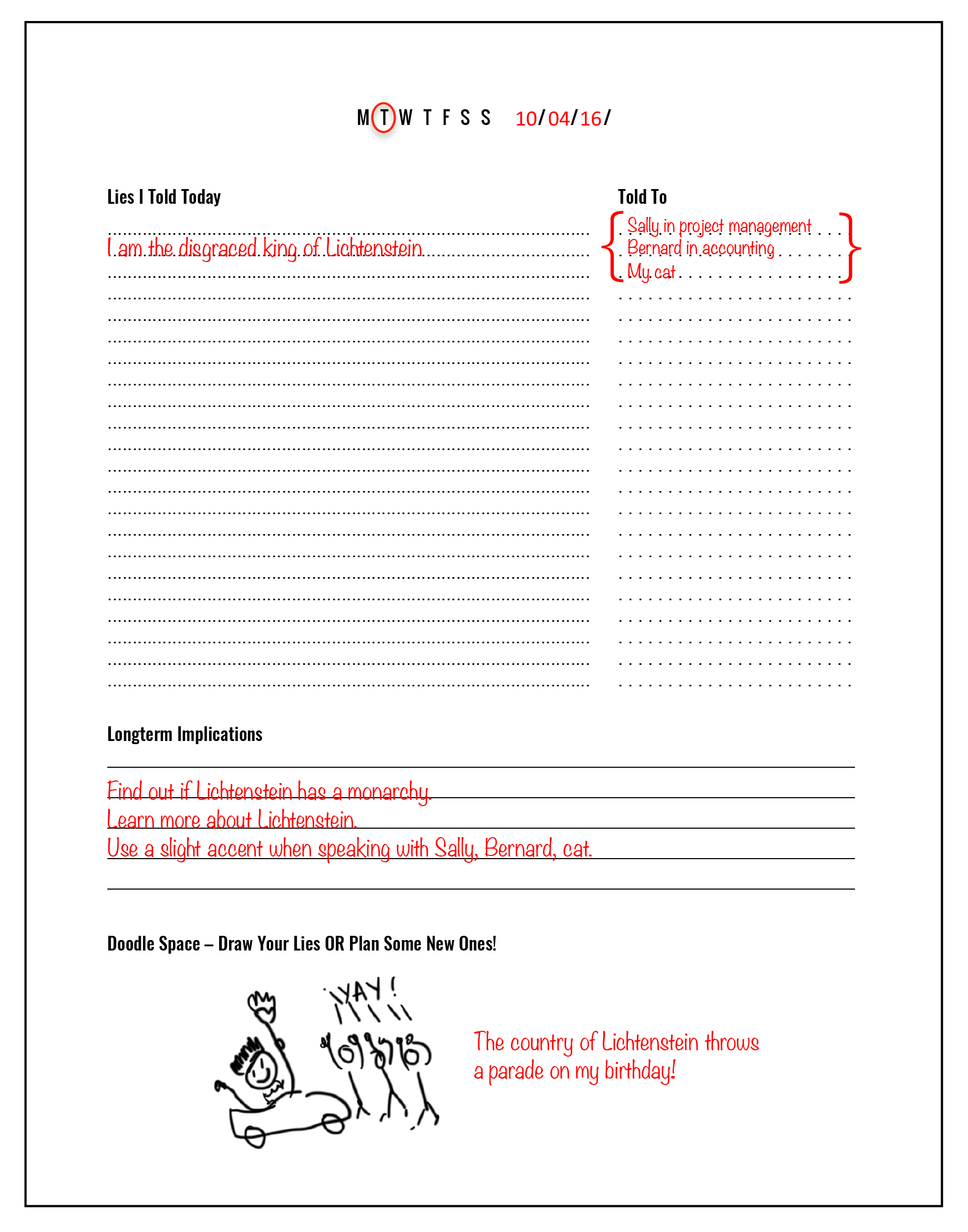 - Finally, under Doodle Space, indulge in a little lie-related (not to mention stress-relieving) fun! Draw your lie(s) or plan exciting new ones!